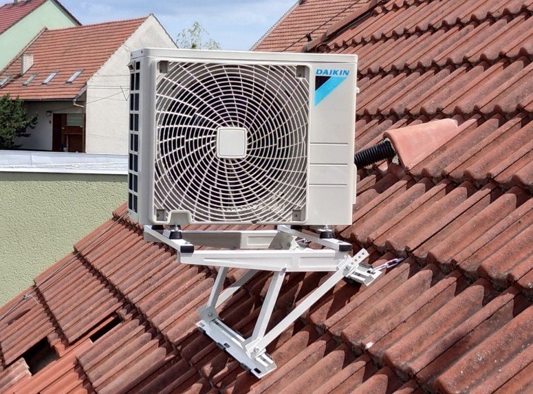 Víte, proč je klimatizace na střeše na této fotce otočena tímto způsobem? Je to proto, aby ventilátor venkovní jednotky nebyl při provozu na svoje potřebné otáčky ovlivněn větrem z otevřené louky za zahradou. Správné natočení je klíčové pro funkci a ochranu ventilátoru. Nebo také pro nasměrování hlučnosti klimatizace potřebným směrem.