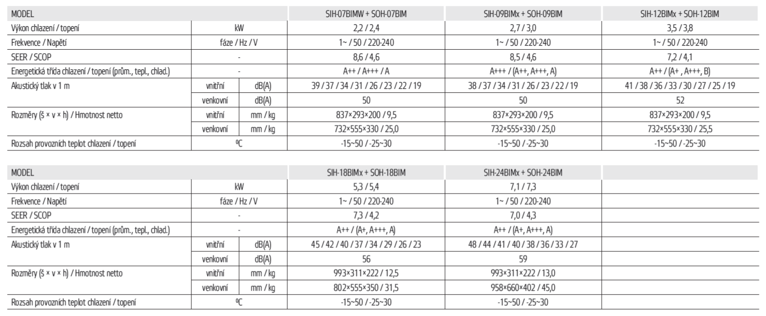 Klimatizace Sinclair Marvin - nejvyšší řada a nejvyšší stupeň výbavy. Wifi modul součástí vnitřní jednotky. Nastavitelný rozsah teplot pro režim vytápění +8°C až +30 °C dle potřeby. ( běžné klimatizace umí topit jen +16°C a více !! ). Odvlhčování dle nastavené hladiny vlhkosti 40%, 60% dle volby. Hlučnost vnitřní jednotky od 19 dB(A) a více dle zvoleného režimu ventilátoru, Noční režim pro tichý chod venkovní jednotky 40 dBA. Vnitřní jednotka nabízí 7 rychlostí ventilátoru, UV-C lampa pro sterilizace vzduchu, Cold plasma generátor pro zlepšení vzduchu, funkce omezení příkonu zařízení na 50%, 75% a 100% výkonu. Provoz vytápění do -25°C venkovní teploty a vyhřívání dna venkovní jednotky. Pohyb lamel vodorovně i svisle, Skrytý displej, Funkce "I FEEL pro konfortní řízení teploty. Možnost volby nástěnného drátového ovladače.", K dispozici v různých barevných variantách – tmavá modrá navi (SIH-XXBIMN), stříbrná (SIH-XXBIMS), champagne (SIH-XXBIMC), bílá (SIH-XXBIMW) a Novinkou 2026 je barva Černá Antracitová (SIH-XXBIMB)