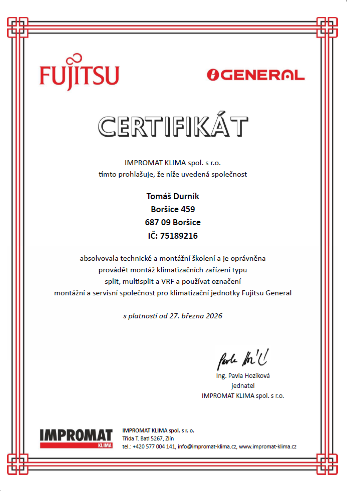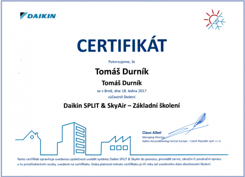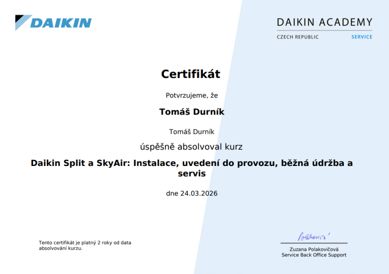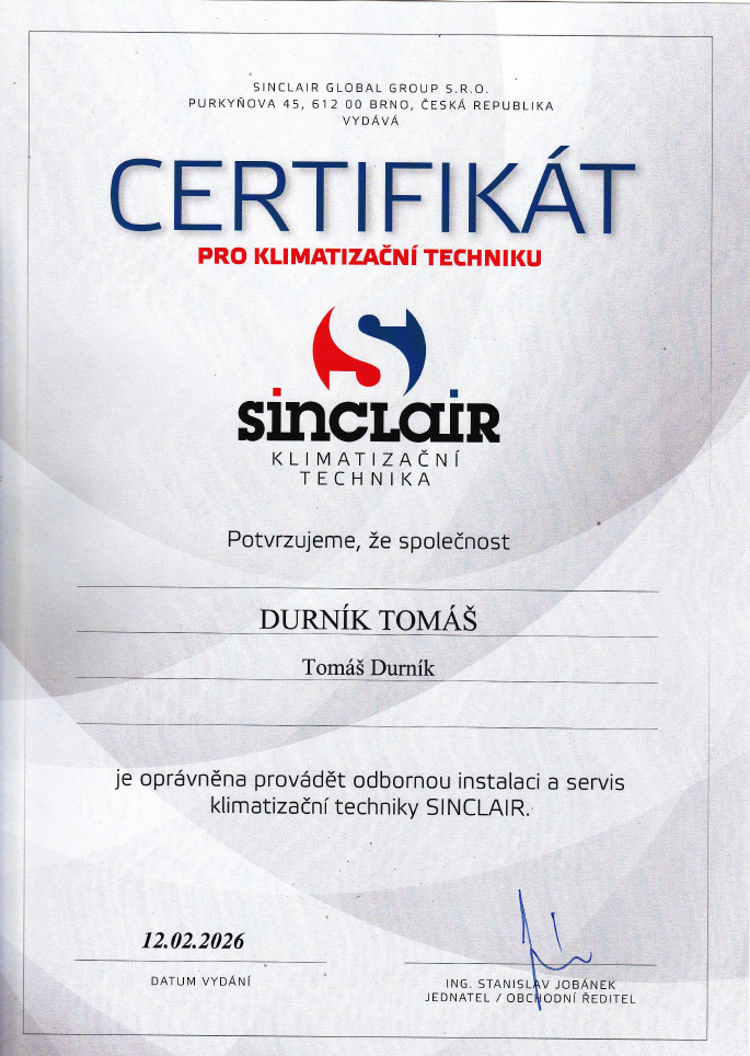 Jsem držitelem všech zákonných oprávnění (F-plyny, Elektro, Pájení) a certifikovaným partnerem značek Daikin, Toshiba, Sinclair, Fujitsu a Mitsubishi. Díky této odbornosti vám garantuji profesionální instalaci a kompletní záruční i pozáruční servis.